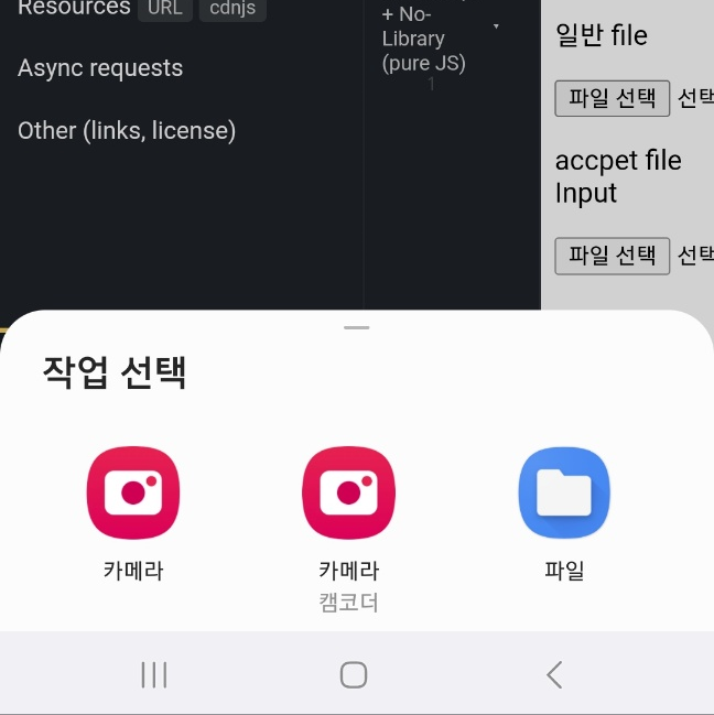 모바일에서 작업 선택이라고 바텀 시트가 올라오면서 카메라 - 갤러리 - 파일 이런식으로 선택을 할 수 있는 속성을 알게 되었습니다. 여태 input type="file" 에서 속성을 추가하면 간단하게 해결이 됩니다. 하지만 PC 에서는 일반 input file로 보이기 때문에 테스트는 모바일해야 합니다.