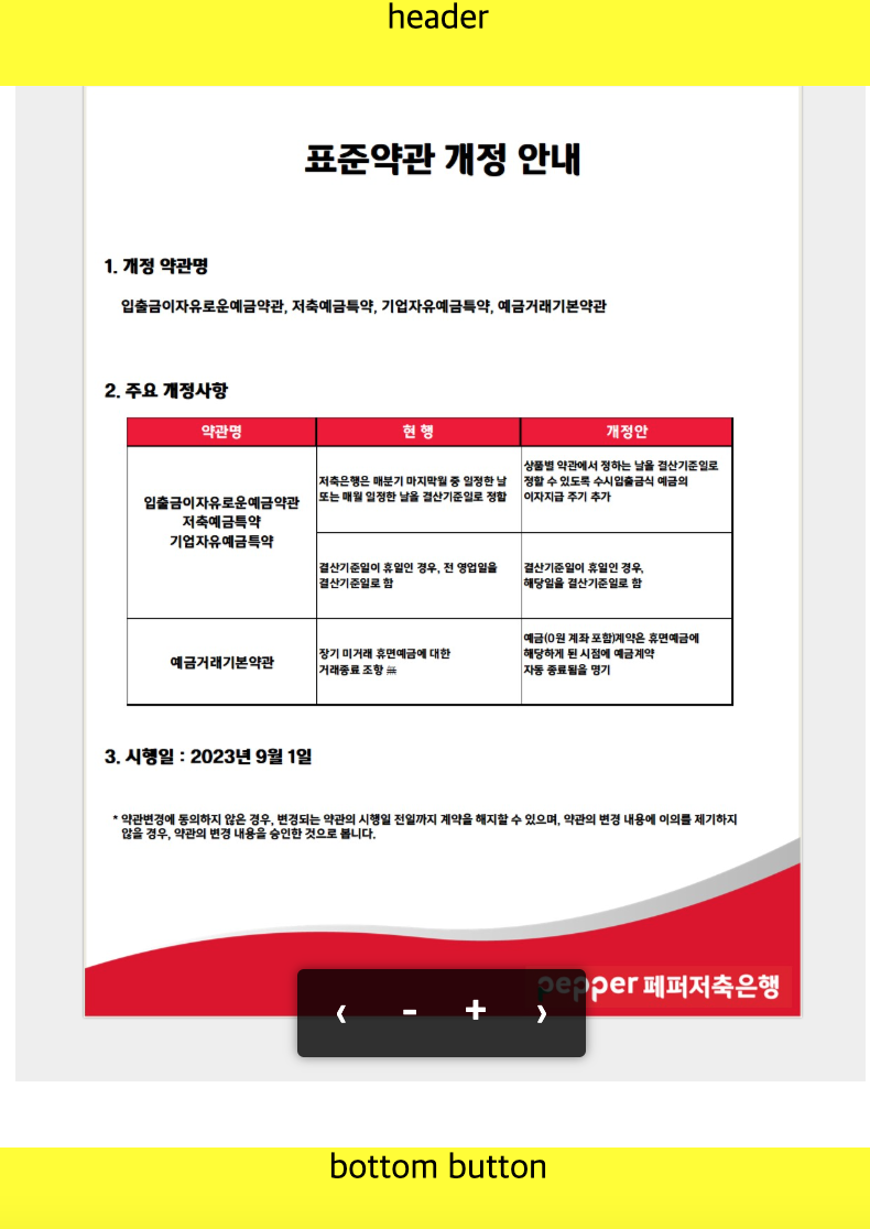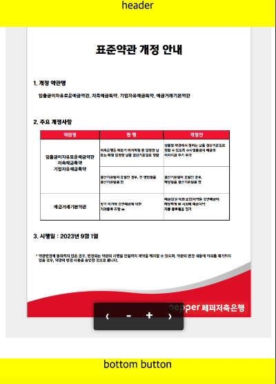 이번에 필요했던 기능은 header와 bottom을 고정한 상태에서 이미지 영역만 확대를 시킬 수 있는 기능이 필요 했습니다. 은행이나 카드 상품 정보에서 약관을 PDF나 이미지 정보로 보여주는 기능을 볼 수 있는데, 이 기능이 필요해서 작성을 하게 되었습니다.